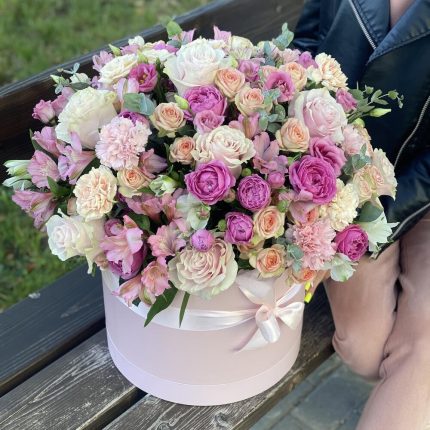 Коробка Тоскана из эустомы, кустовых и одноголовых роз, диантуса и альстромерии
