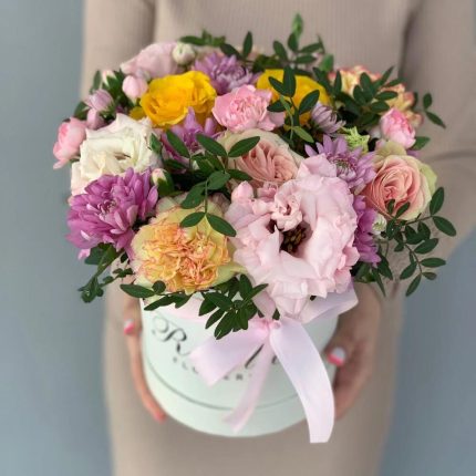Хризантемы и Пионовидные кустовые розы в коробке + открытка ручной работы в подарок