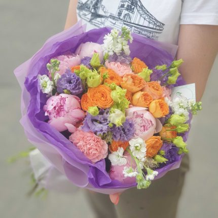 Бархатный цилиндр из голубых диантусов, розовых пионов и ароматной маттиолы