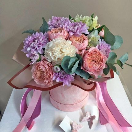Цветы в большой коробке: садовые розы, лизиантус, маттиола, тюльпаны