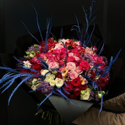 Садовая композиция с гортензиями, пионами, пионвоидными розами и колокольчиками