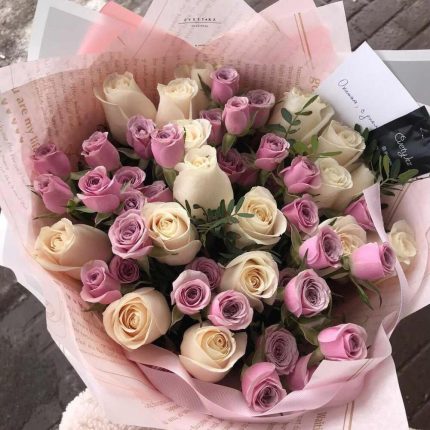 45 роз розовых и белых в коробке