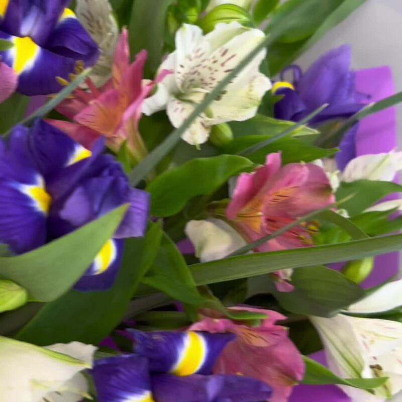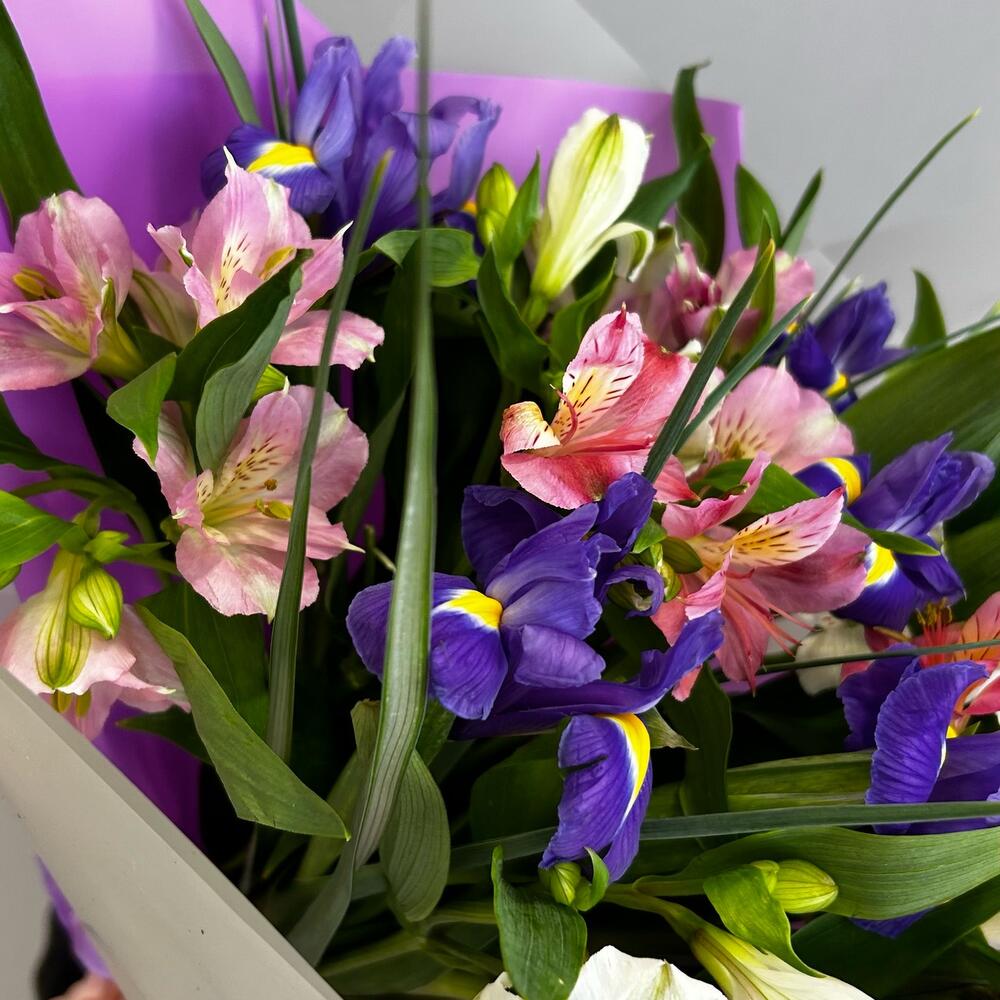 Альстромерия – 8 шт.Ирис – 7 шт.Зелень – 3 шт.Лента атласная – 2 шт.Упаковка дизайнерская – 2 шт.