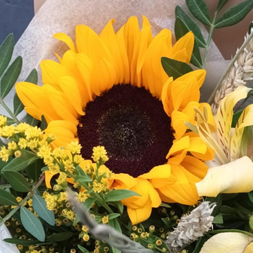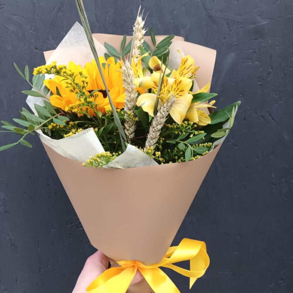 Альстромерия – 1 шт.Солидаго – 1 шт.Лента атласная – 1 шт.Подсолнух – 1 шт.Фисташка – 2 шт.Упаковка дизайнерская – 2 шт.триникум колосья – 3 шт.