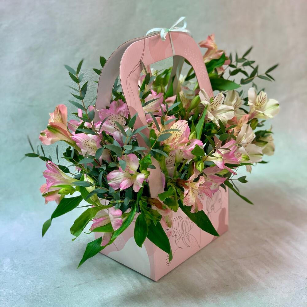 Альстромерия – 8 шт.Эвкалипт – 2 шт.Оазис флористический – 1 шт.Сумка картон – 1 шт.