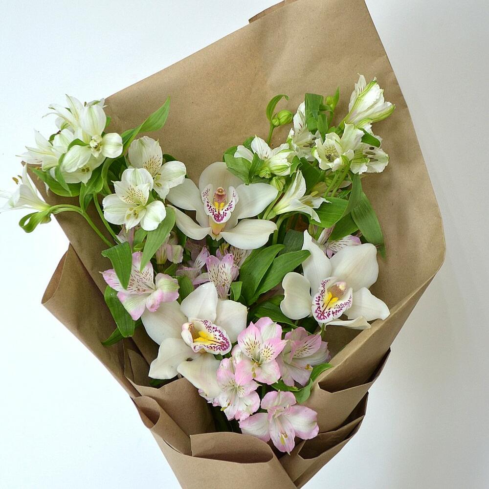 Альстромерия – 7 шт.орхидея – 3 шт.Крафтовая упаковка – 1 шт.