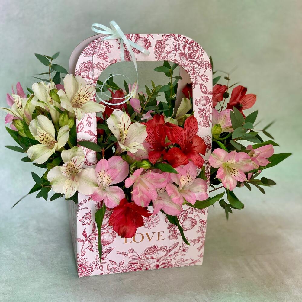 Альстромерия – 8 шт.Эвкалипт – 2 шт.Оазис флористический – 1 шт.Сумка картон – 1 шт.
