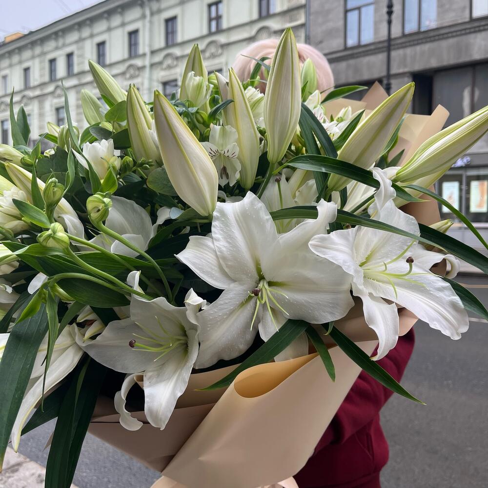 Эвкалипт – 10 шт.Лента атласная – 4 шт.Альстромерия белая – 10 шт.Фрезия белая – 9 шт.Лилия белая – 9 шт.Упаковка корейская пленка – 2 шт.