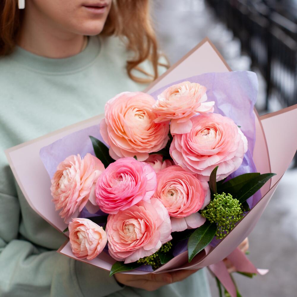 Ранункулюс розовый – 9 шт.Скиммия – 4 шт.Упаковка дизайнерская – 1 шт.