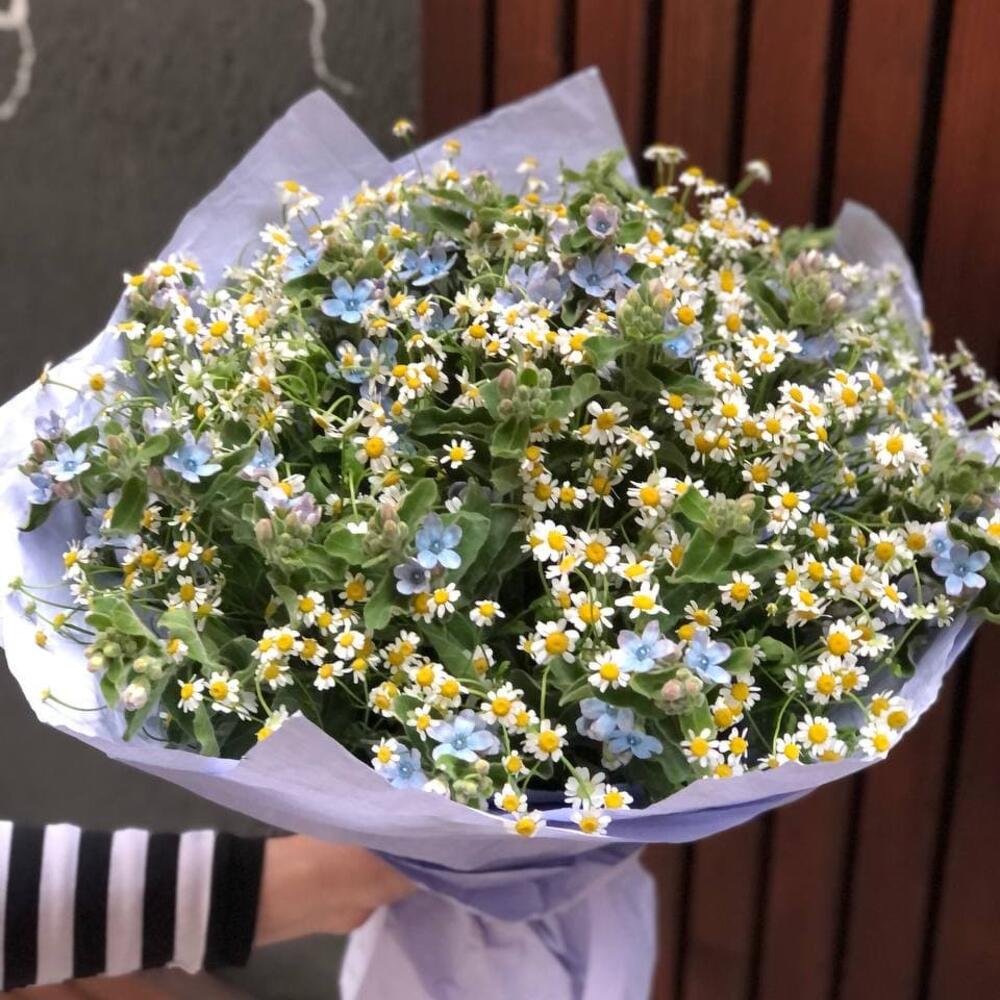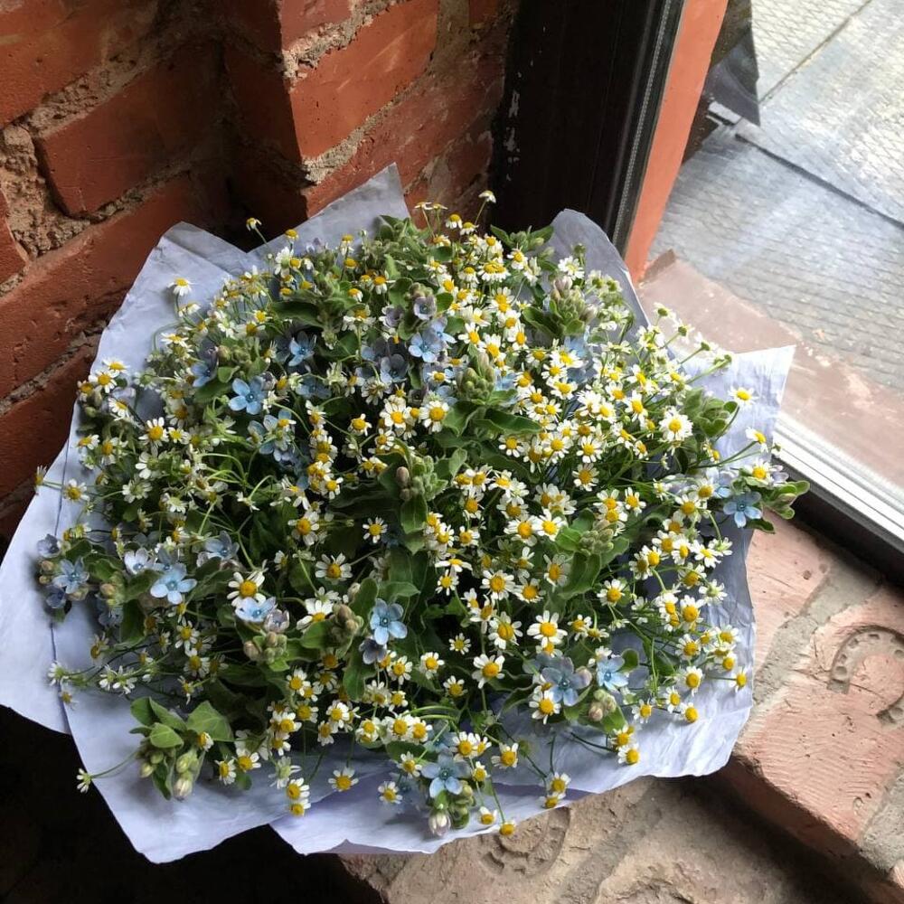 Букет из матрикарии и твидии в стильной упаковке “Луговая нежность”