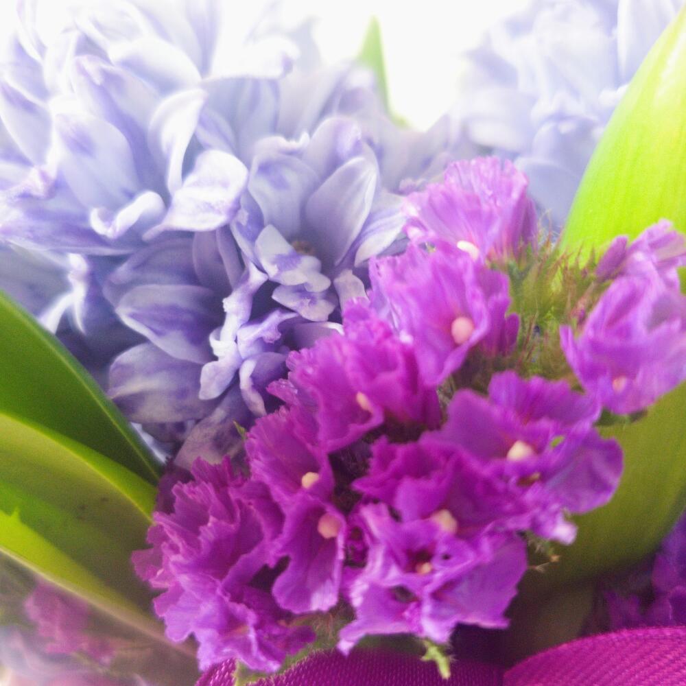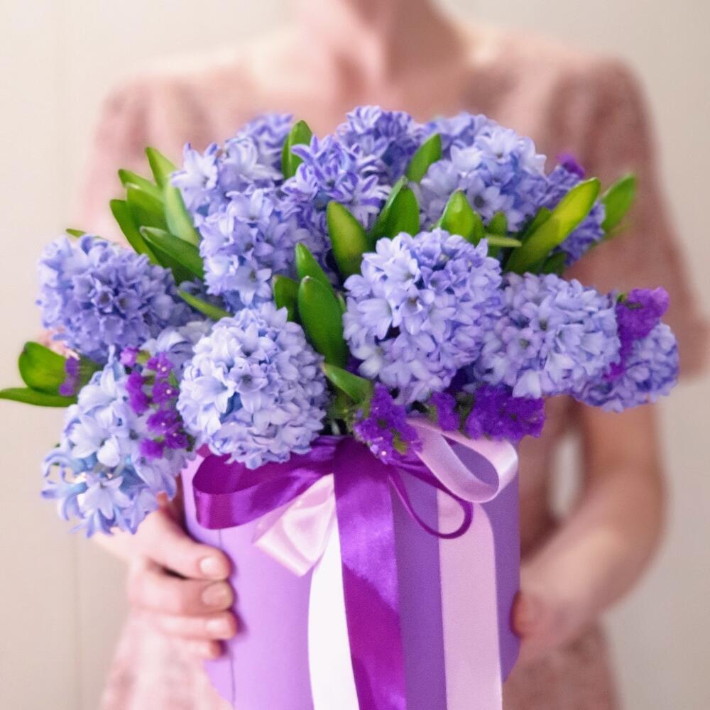 Лента атласная – 2 шт.Коробка шляпная – 1 шт.Статица фиолетовая – 3 шт.Аквапак – 1 шт.Открыточка с вашими пожеланиями – 1 шт.гиацинты – 15 шт.