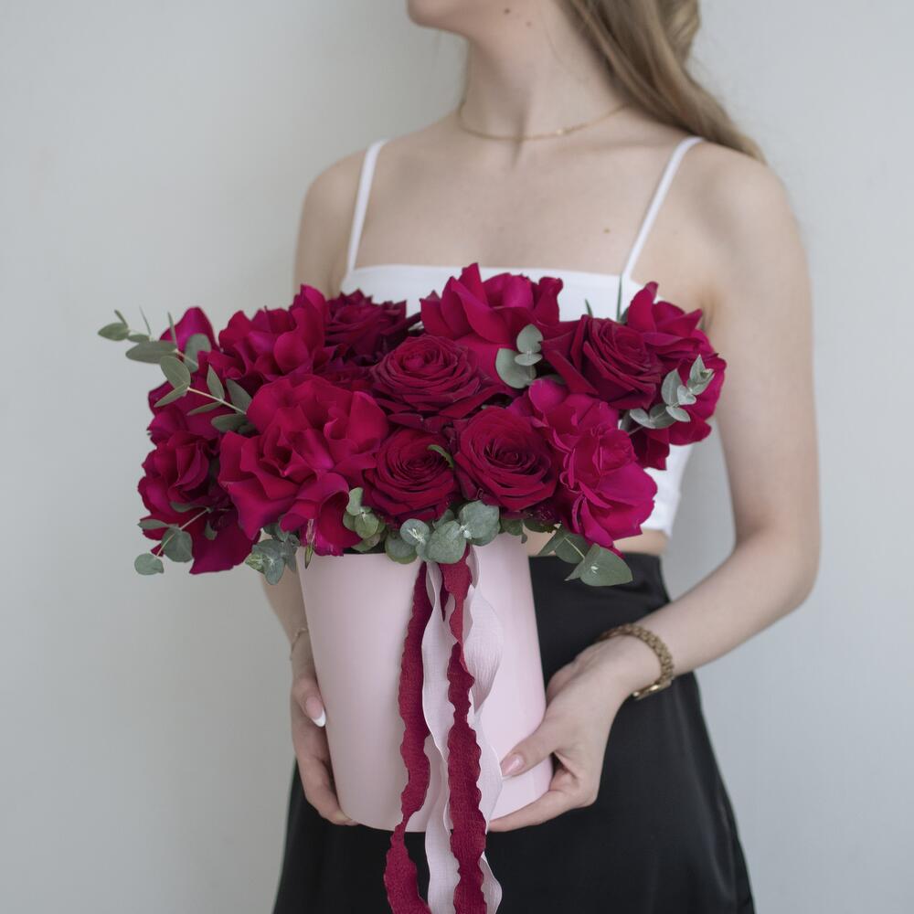 розы французские готча – 7 шт.розы красные red naomi – 10 шт.Эвкалипт цинерея – 5 шт.Коробка шляпная – 1 шт.
