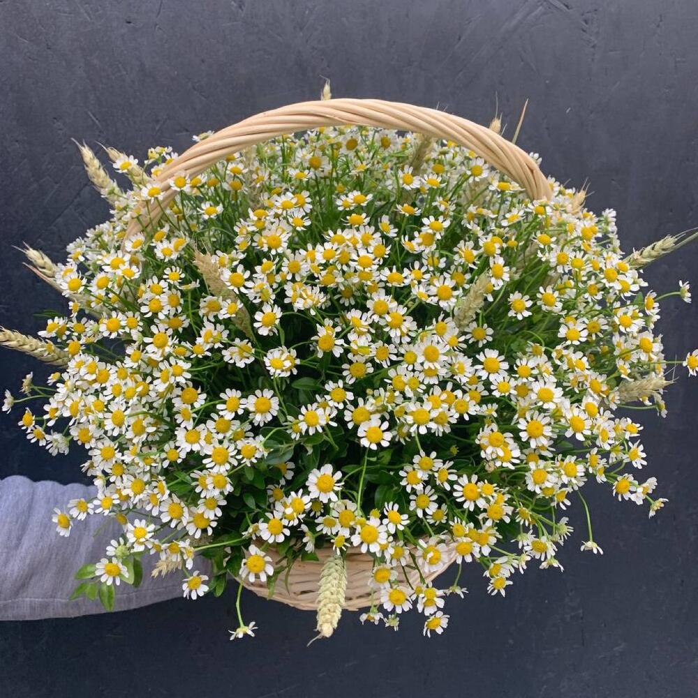 Корзина из ромашки (матрекарии), триникума, зелени «Летнее танго»