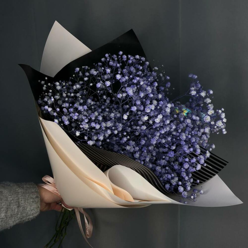 Корейская пленка – 2 шт.Лента атласная – 1 шт.гипсофила окрашенная фиолетовая – 5 шт.