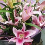 Лилия розовая – 9 шт.Гипсофила – 3 шт.Упаковка дизайнерская – 3 шт.