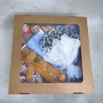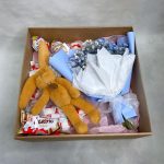 Гипсофила – 3 шт.Упаковка – 1 шт.Kinder bueno – 1 шт.Kinder сюрприз – 2 шт.Kinder chocolate – 1 шт.Raffaello конфеты – 10 шт.коробка крафт с окошком – 1 шт.игрушка зайчонок lapkin – 1 шт.