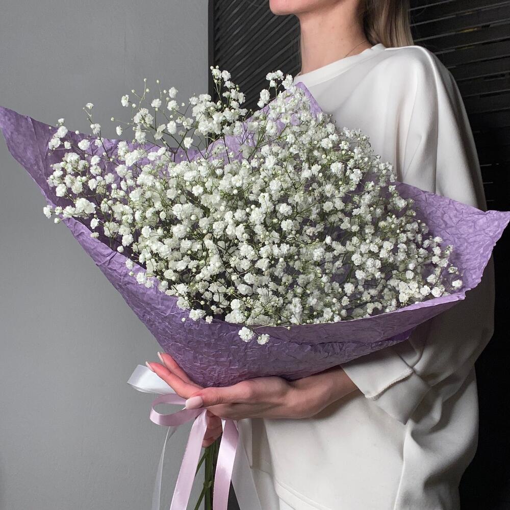 гипсофила белая – 5 шт.Корейская пленка – 1 шт.Атласная лента – 2 шт.