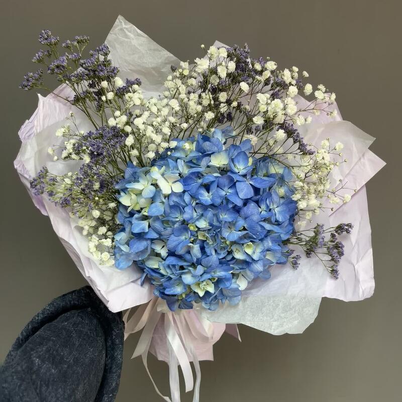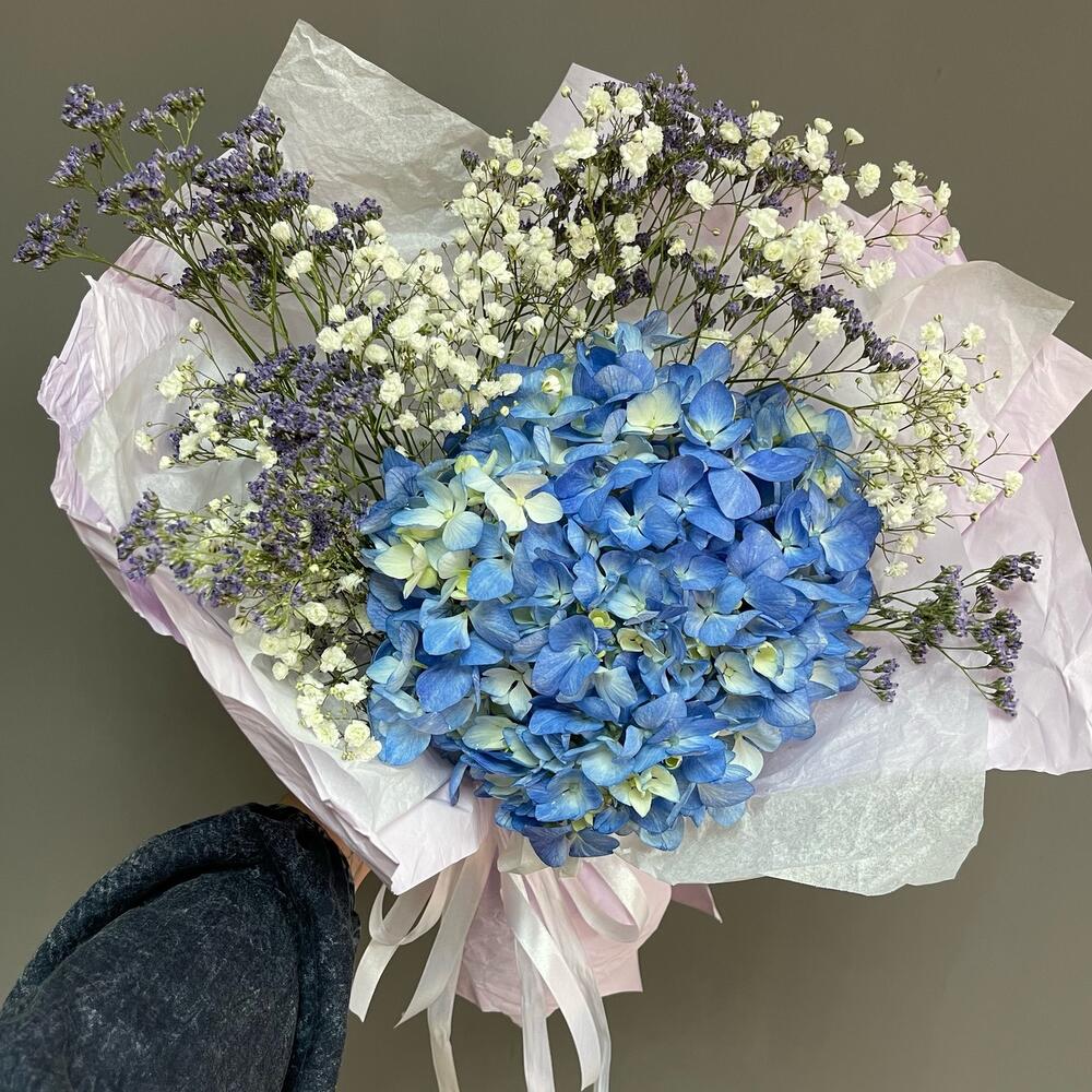 Гипсофила – 2 шт.Гортензия – 1 шт.Лимониум – 3 шт.Упаковка дизайнерская – 1 шт.