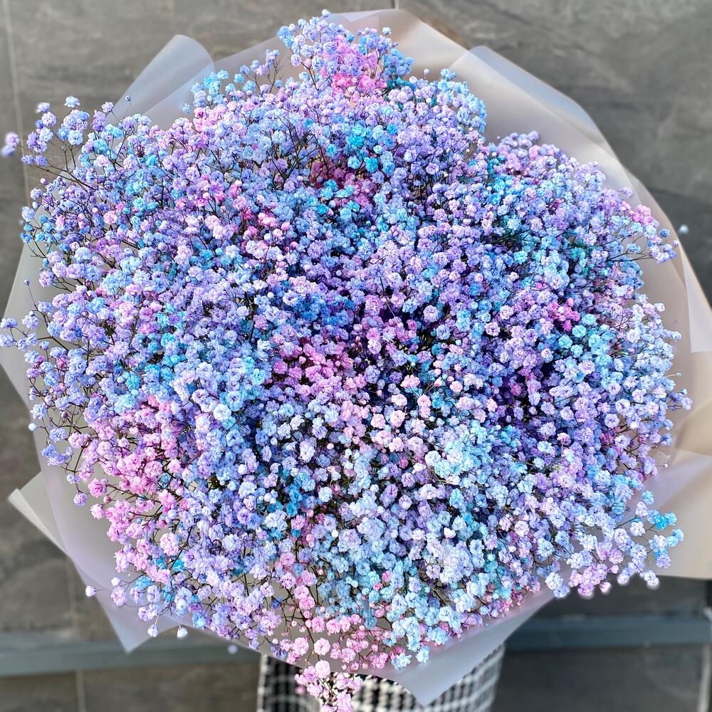 Лента атласная – 1 шт.Упаковка дизайнерская – 3 шт.гипсофила радужная – 25 шт.