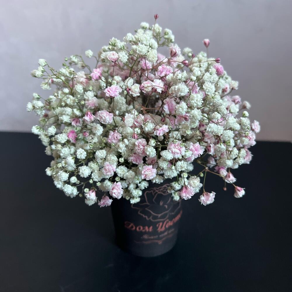 “Сиреневый туман” – композиция из гипсофилы в шляпной коробке