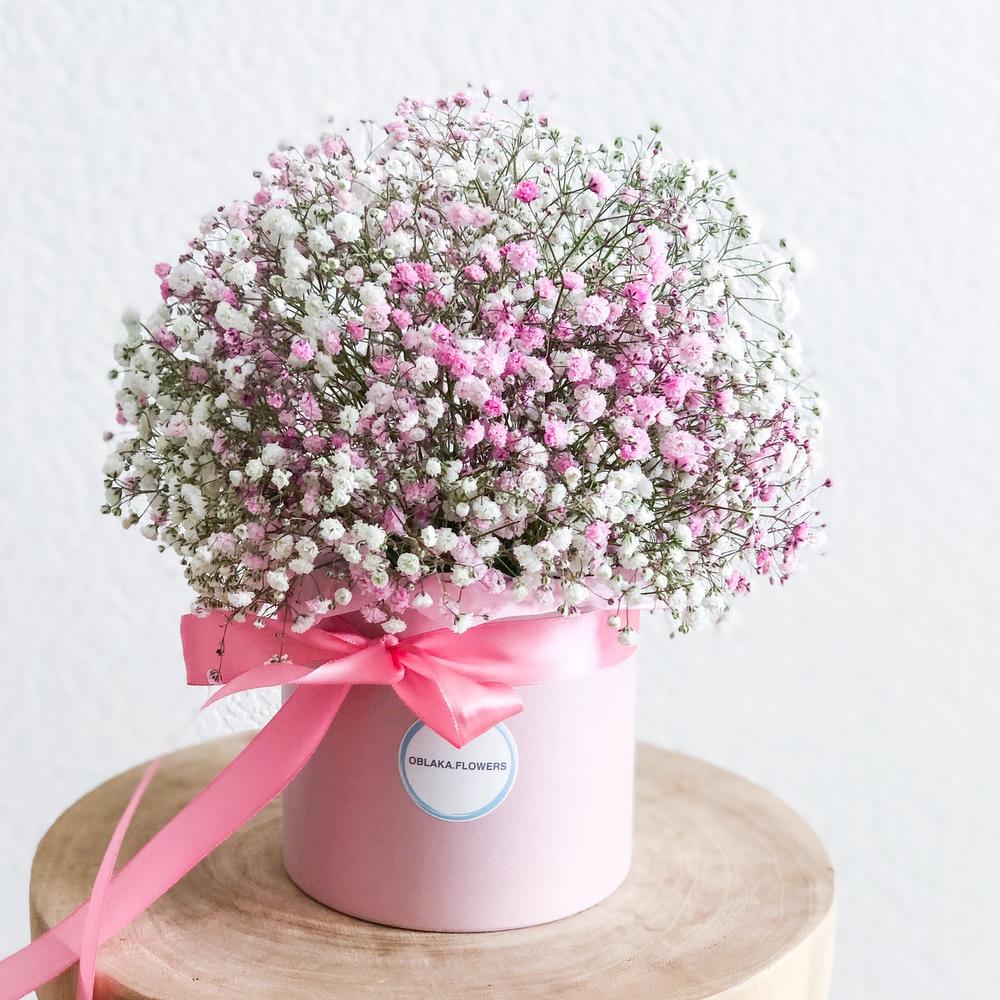 гипсофила белая – 2 шт.гипсофила цветная – 3 шт.Коробка шляпная – 1 шт.Лента атласная – 1 шт.Тишью – 1 шт.Губка флористическая – 1 шт.