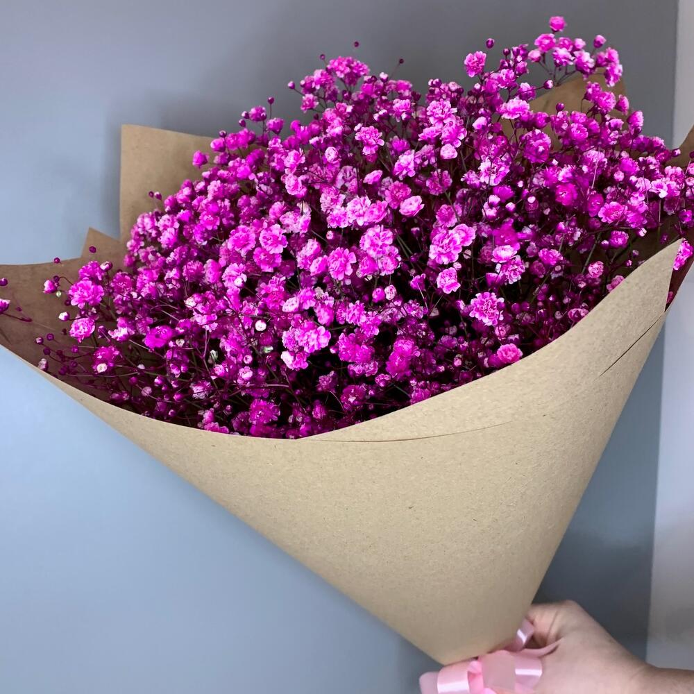 гипсофила радужная – 5 шт.Упаковка дизайнерская – 2 шт.Лента атласная – 2 шт.
