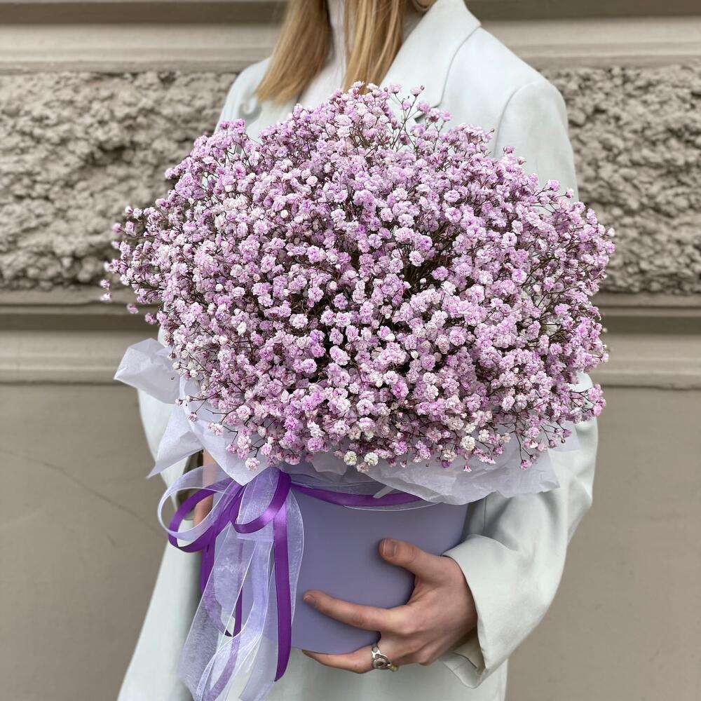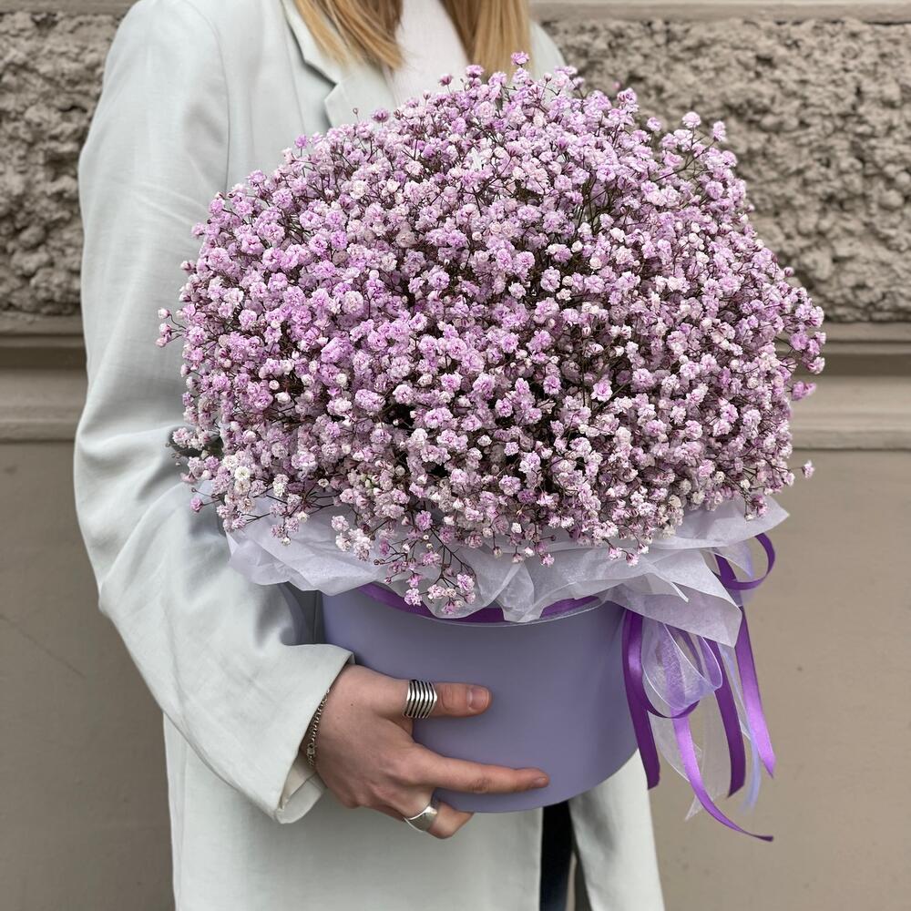 “Сиреневый туман” – композиция из гипсофилы в шляпной коробке