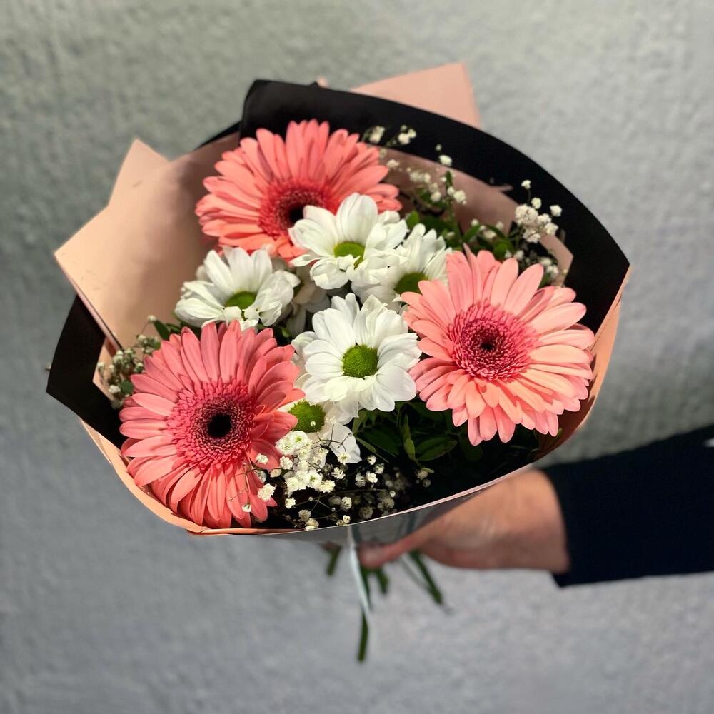 герберы – 3 шт.Хризантема кустовая – 1 шт.Гипсофила – 2 шт.фисташка зелень – 3 шт.Упаковка дизайнерская – 1 шт.