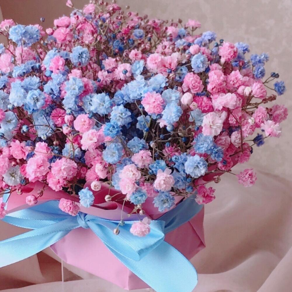 Лента атласная – 1 шт.Флористическая губка (оазис) – 1 шт.Гипсофила розовая – 2 шт.Гипсофила голубая – 1 шт.