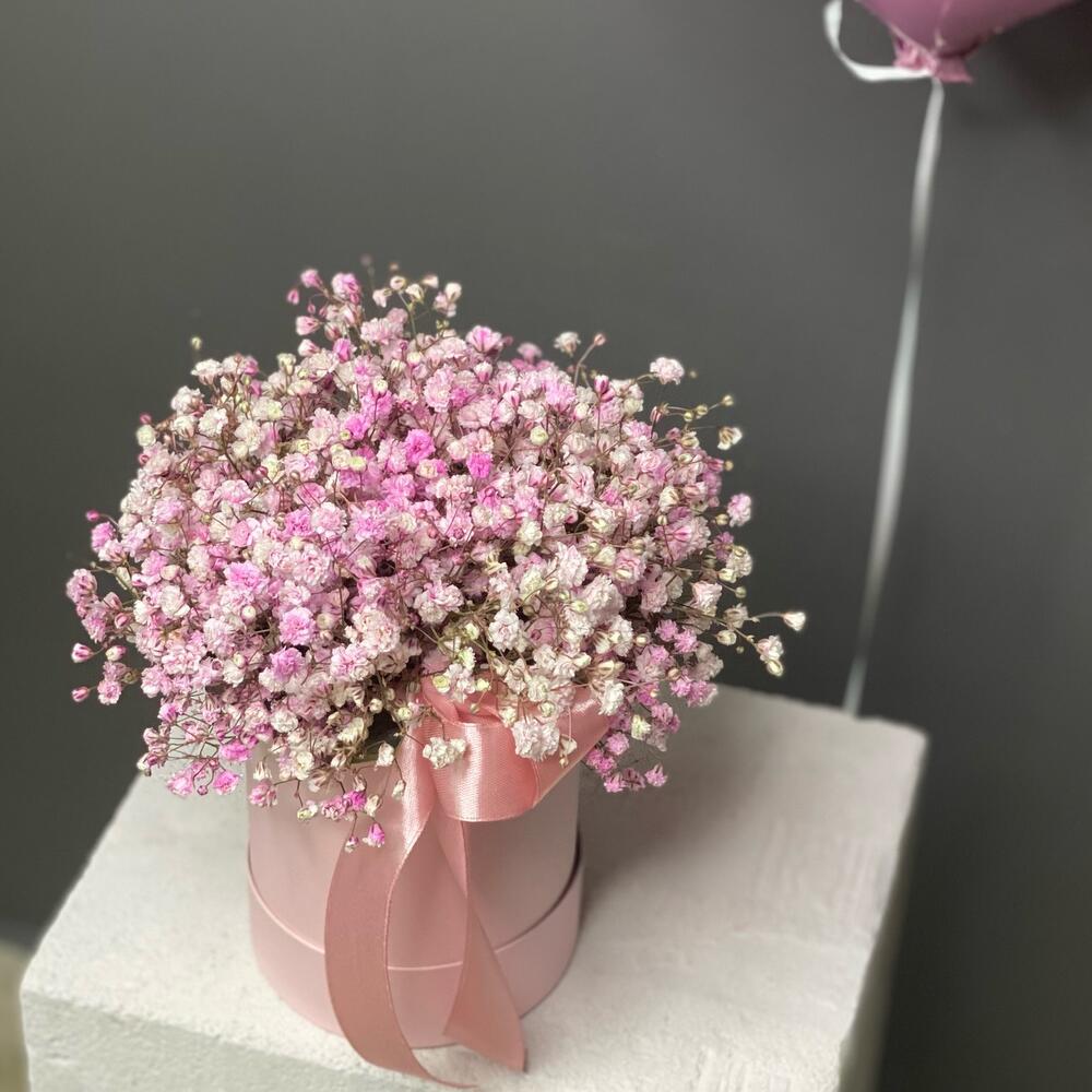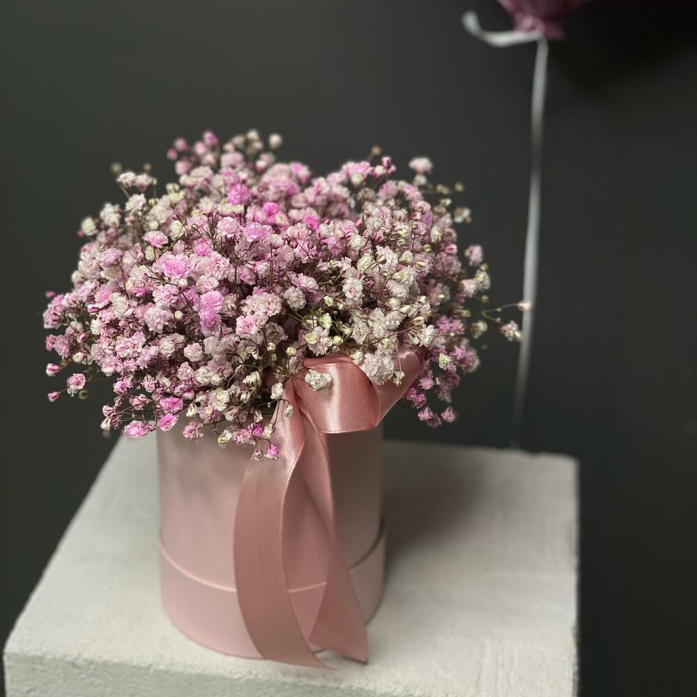 “Сиреневый туман” – композиция из гипсофилы в шляпной коробке