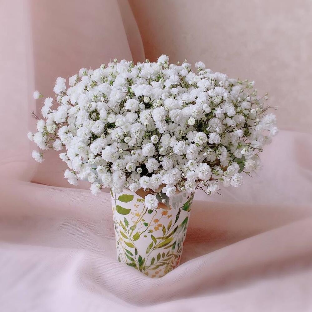 Небольшая композиция белая гипсофила в бумажном стакане