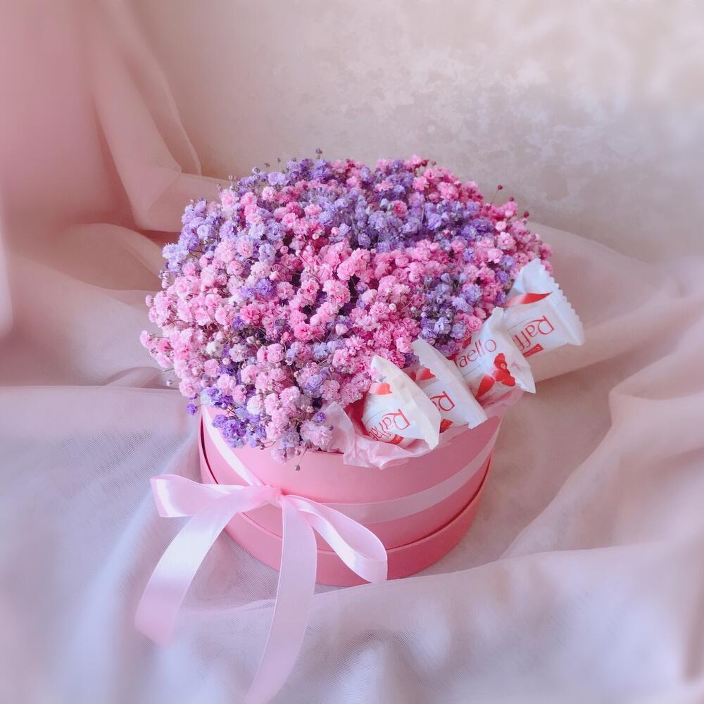 Конфеты Raffaello – 4 шт.Шляпная коробка с лентой – 1 шт.Флористическая губка – 1 шт.гипсофила радужная – 5 шт.