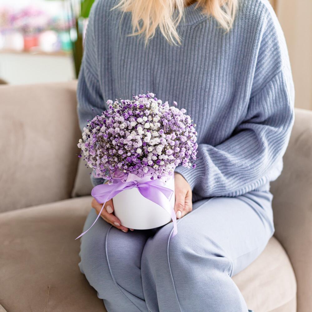 Очаровательная, воздушная композиция из гипсофилы, в шляпной коробке.Цветы стоят в специальной флористической губке,что позволяет им больше оставаться свежими и радовать получателя. Так же композиция в коробке это очень удобно и эффектно, так как не надо ставить букет в вазу и менять воду. Необходимо лишь подливать в губку воду.Инструкция по уходу за цветами прикреплена к каждому заказу.Цветы гипсофилы отличаются стойкостью и даже при высыхании не теряют, декоративности и цвета. Что позволяет, долгое время украшать интерьер в качестве сухоцветов.Подпишем открытку с вашими пожеланиями бесплатно