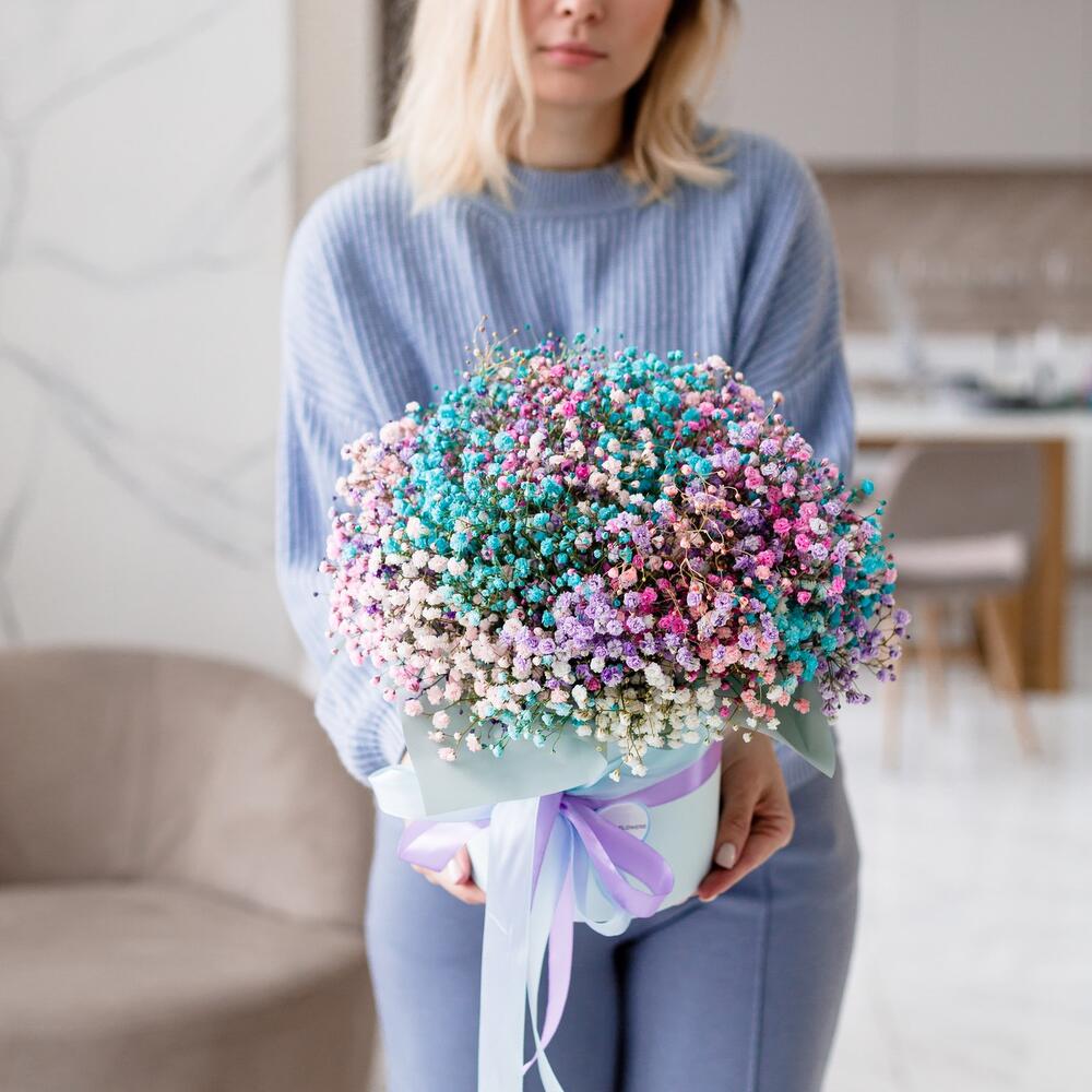 Очаровательная, воздушная композиция из гипсофилы, в шляпной коробке.Цветы стоят в специальной флористической губке,что позволяет им больше оставаться свежими и радовать получателя. Так же композиция в коробке это очень удобно и эффектно, так как не надо ставить букет в вазу и менять воду. Необходимо лишь подливать в губку воду.Инструкция по уходу за цветами прикреплена к каждому заказу.Цветы гипсофилы отличаются стойкостью и даже при высыхании не теряют, декоративности и цвета. Что позволяет, долгое время украшать интерьер в качестве сухоцветов.Подпишем открытку с вашими пожеланиями бесплатно