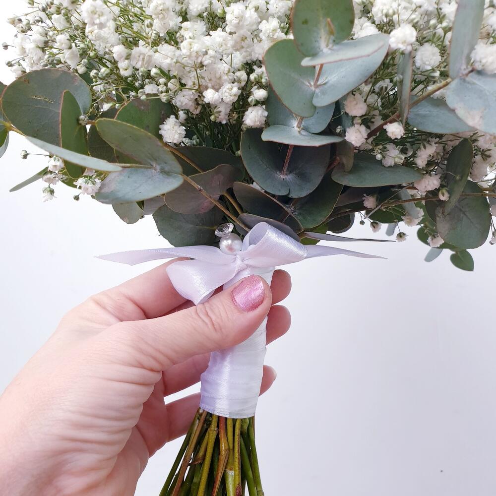 Лента атласная – 10 шт.Эвкалипт Baby Blue – 5 шт.Булавка с бусами – 1 шт.гипсофила белая – 15 шт.