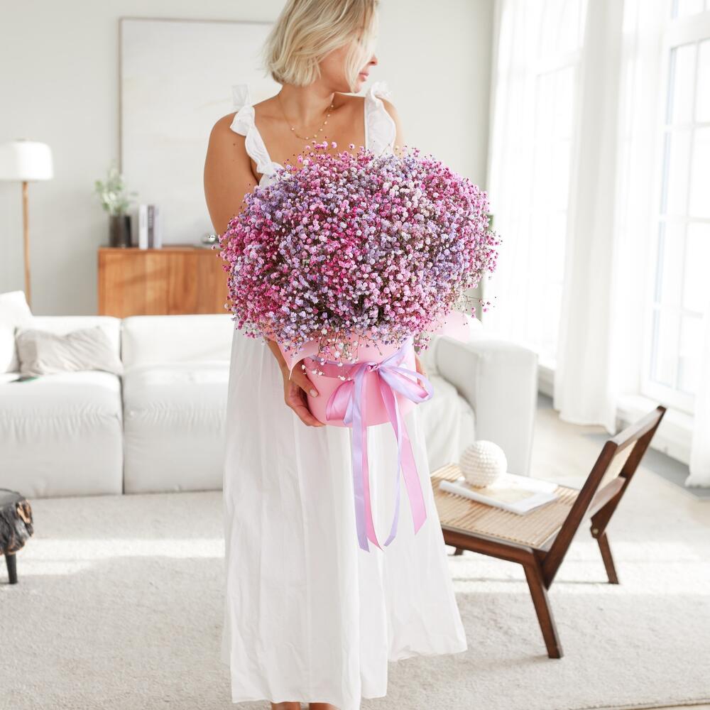 Очаровательная, воздушная композиция из гипсофилы, в шляпной коробке.Цветы стоят в специальной флористической губке,что позволяет им больше оставаться свежими и радовать получателя. Так же композиция в коробке это очень удобно и эффектно, так как не надо ставить букет в вазу и менять воду. Необходимо лишь подливать в губку воду.Инструкция по уходу за цветами прикреплена к каждому заказу.Цветы гипсофилы отличаются стойкостью и даже при высыхании не теряют, декоративности и цвета. Что позволяет, долгое время украшать интерьер в качестве сухоцветов.Подпишем открытку с вашими пожеланиями бесплатно