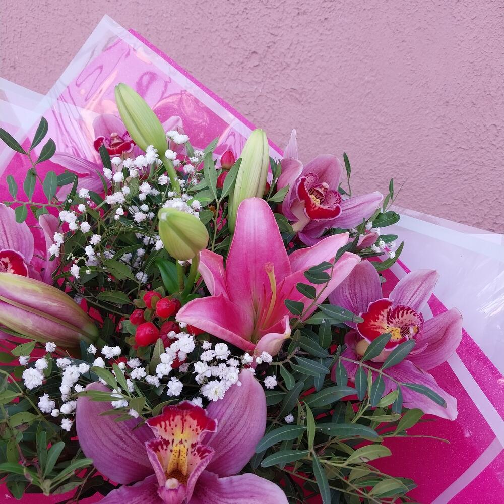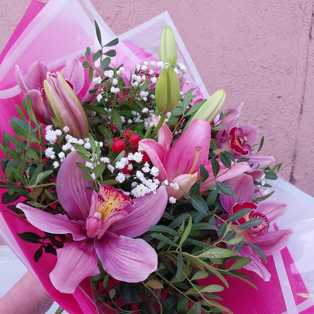Гипсофила – 1 шт.Упаковка дизайнерская – 3 шт.Орхидея Цимбидиум розовый – 5 шт.Хиперикум красный – 2 шт.фисташка зелень – 10 шт.лилия розовая азиатская – 1 шт.