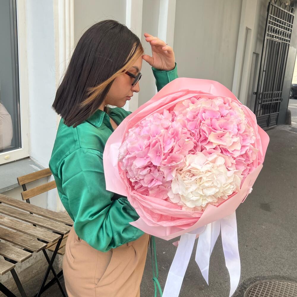 Гортензия розовая – 3 шт.Упаковка дизайнерская – 3 шт.Тишью – 2 шт.