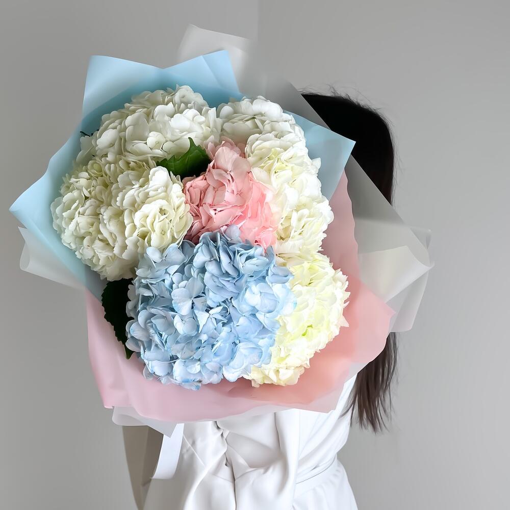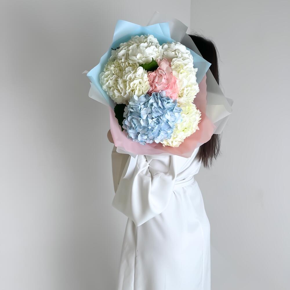гортензия колумбия – 7 шт.Упаковка дизайнерская – 1 шт.ленты фирменные – 1 шт.