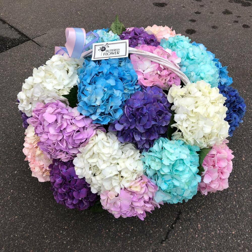 Корзина из 25 огромных гортензий «Летняя мозаика»