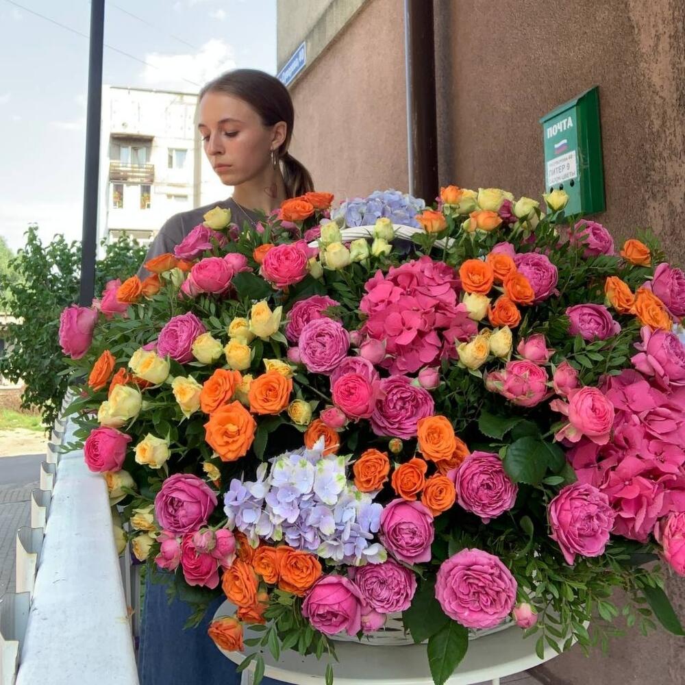 Гортензия – 10 шт.пионовидные розы кустовые Misty Bubbles – 20 шт.розы кустовые кремовые – 15 шт.розы кустовые оранжевые – 15 шт.Пистация пучок – 5 шт.Корзина плетеная – 1 шт.Оазис флористический – 5 шт.