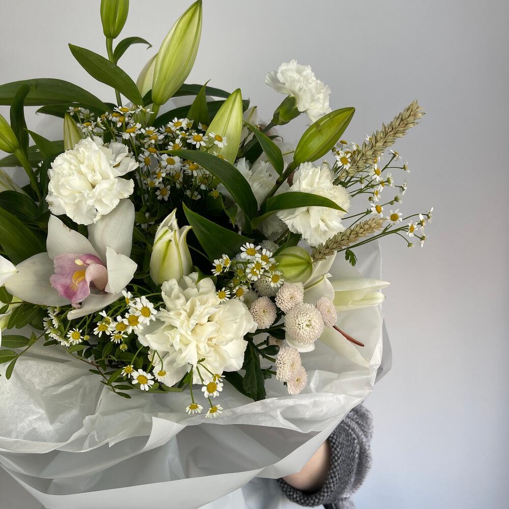 Лилия – 3 шт.Орхидея Цимбидиум – 1 шт.Лента атласная – 2 шт.Диантус – 5 шт.Матрикария – 4 шт.Сантини – 1 шт.Пшеница – 2 шт.Упаковка дизайнерская – 4 шт.Фисташка пучок – 1 шт.