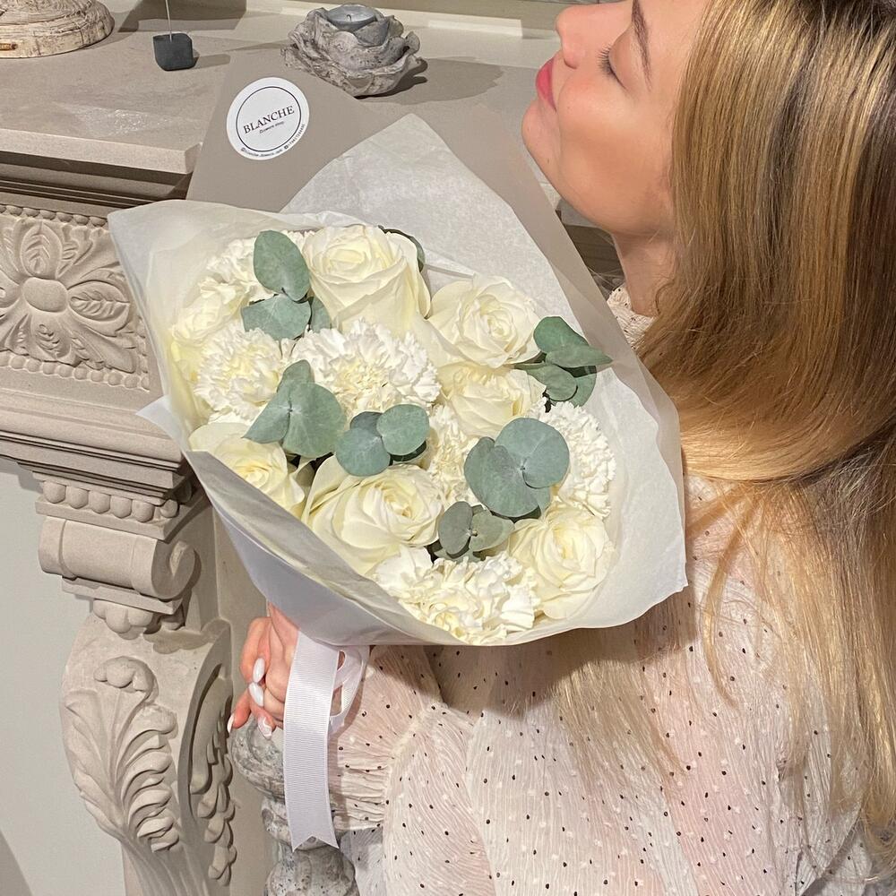 белые розы – 7 шт.Диантус белый – 6 шт.Фирменная упаковка – 1 шт.Эвкалипт – 5 шт.