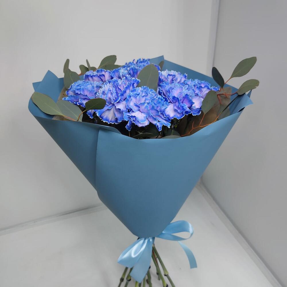 диантусы голубые – 9 шт.Эвкалипт – 1 шт.Дизайнерская упаковка – 1 шт.