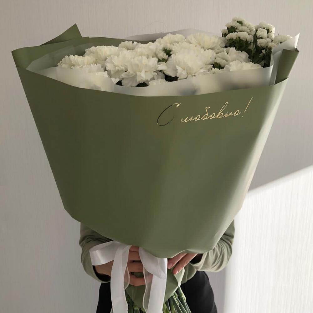 Статица белая – 5 шт.Диантус белый – 25 шт.Дизайнерская упаковка – 1 шт.индивидуальная надпись – 1 шт.ленты атласные – 3 шт.