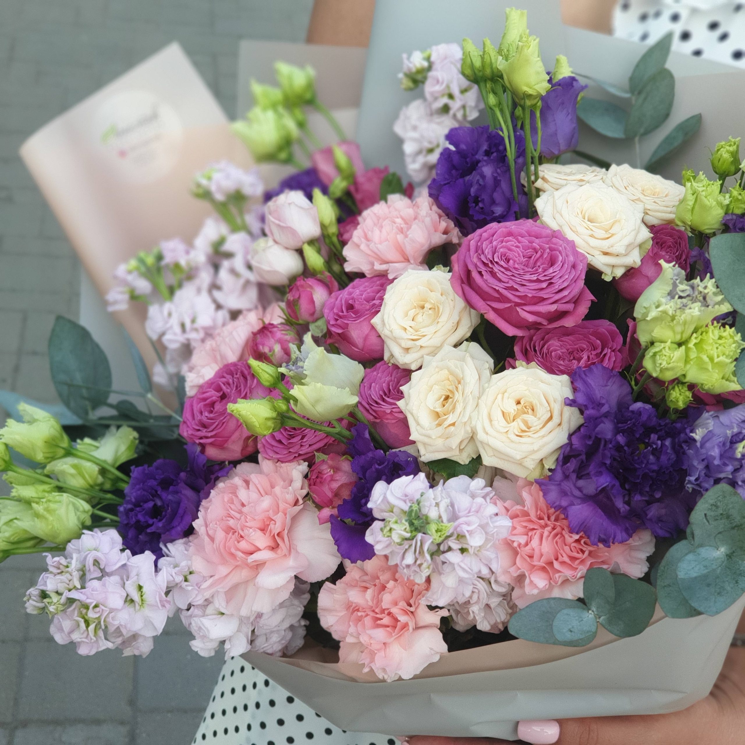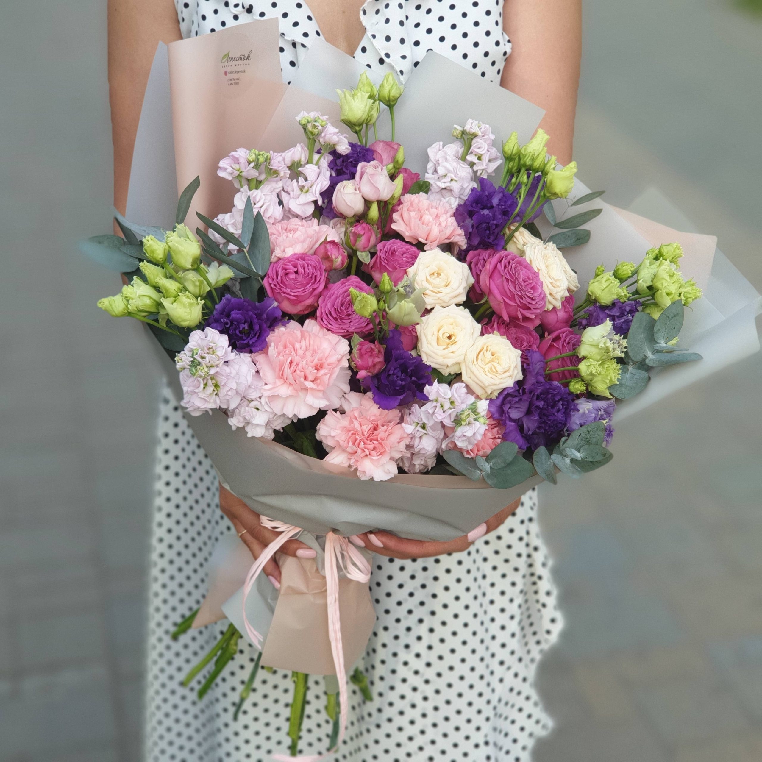 Букет из пионов, пионовидных и кустовых роз и эустом