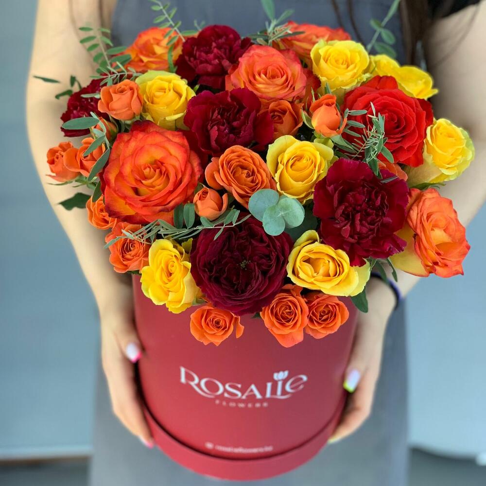 Коробка Богема из кустовых и одноголовых роз, гортензий и озотамнуса