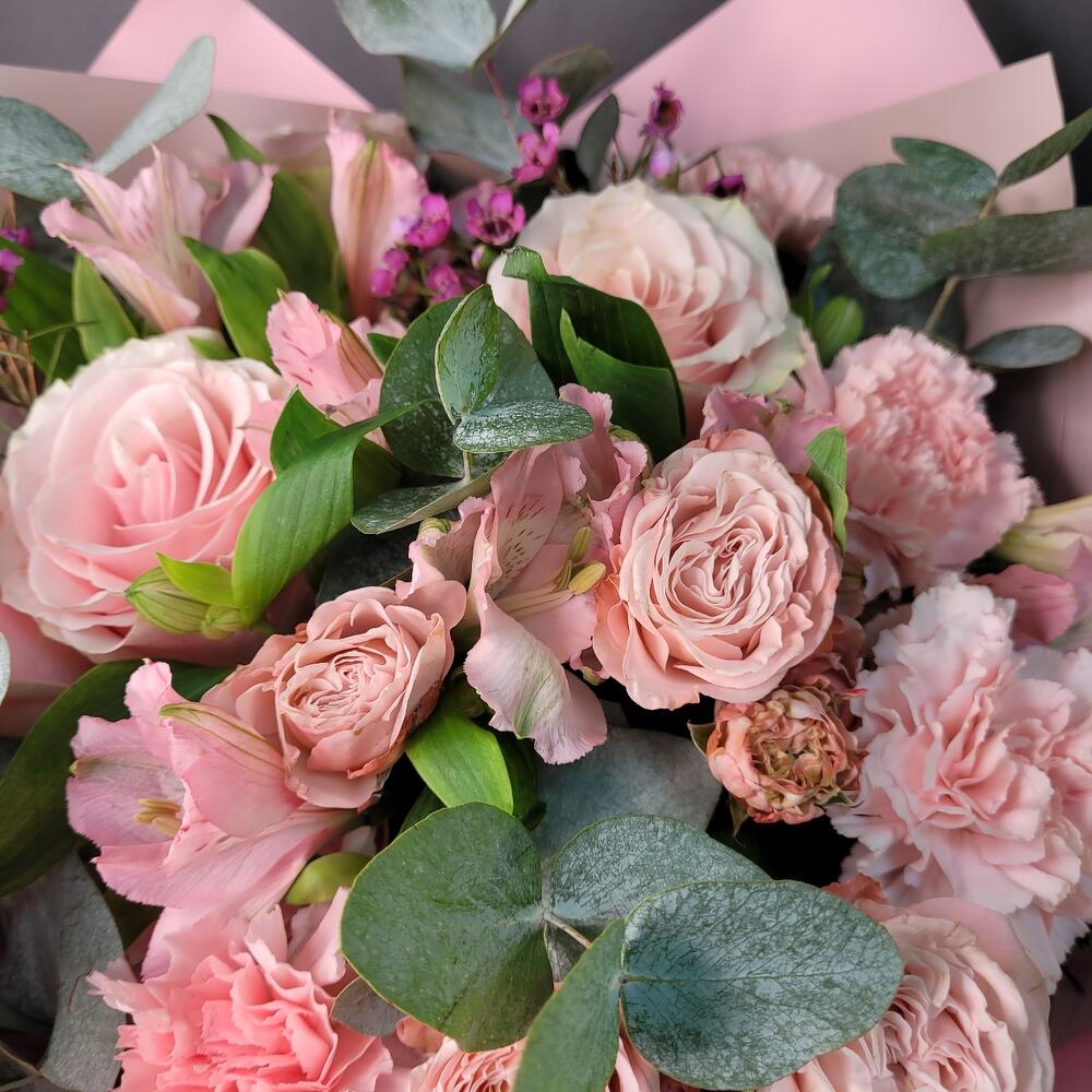 Букет роз, альстромерии и эвкалипта «Розовый закат»