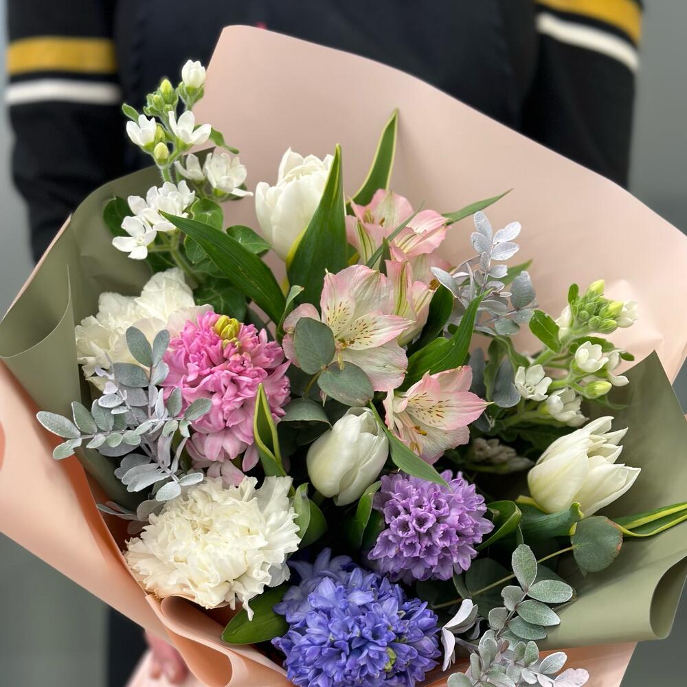 Гиацинт – 3 шт.Тюльпан – 3 шт.Диантус – 2 шт.Альстромерия – 1 шт.Оксипеталум – 2 шт.Фисташка – 3 шт.Дизайнерская упаковка – 2 шт.Лента атласная – 1 шт.
