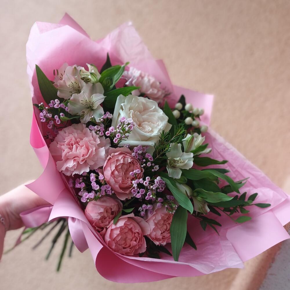 Роза пионовидная одноголовая – 1 шт.Роза кустовая пионовидная – 1 шт.Альстромерия – 2 шт.хамелациум розовый – 1 шт.Гиперикум – 1 шт.Гвоздика – 2 шт.Фисташка – 2 шт.Тишью – 1 шт.Упаковка дизайнерская – 1 шт.Лента атласная – 1 шт.